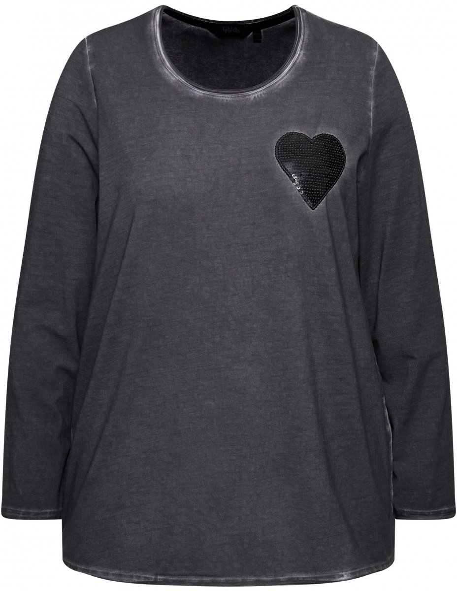 Ulla Popken Cold Dyed Sequined Heart Long Sleeve Tee Asphalt